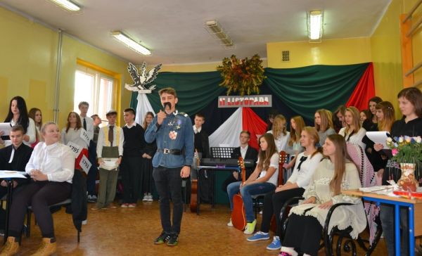 Z tej okazji w szkole odbyła się uroczystość słowno- muzyczna przygotowana pod opieką Pań: Ewy Gołębiowskiej, Katarzyny Koclęgi i Sylwii Wituły - Jedlińskiej, dekorację przygotował Pan Adam Niesyto. W montażu słowno-muzycznym młodzież przypominała historię dążeń Polaków do niepodległości.